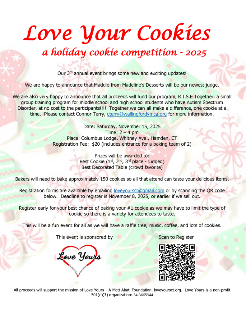 Love Your Cookies will be on Saturday, November 15, 2025, at the KoC Columbus Lodge, Whitney Ave., Hamden. Bakers, please register here – https://forms.gle/QFaxMEM6BPCXVwnr9